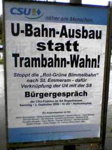 Nein, sowas! Ich wußte nicht, daß die CSU so poetisch sein kann! "Trambahn-Wahn"-Bimmelbahn, das ist schon ein halbes Gedicht, wenn mir jetzt ausser "U-Bahn-Fahn" und Lebertran noch was schönes einfallen würde, wäre es vielleicht schon ein ganzes. Ich frage mich bloß, warum sie "Rot-Grüne Bimmelbahn" in Anführungszeichen setzen. Ist das ein Zitat? Wer sagt denn sowas? Wenn, dann doch die Schwarzen selbst, oder? Kann man sich selbst zitieren? Also, außerhalb einer wissenschaftlichen Arbeit? Oder meinen sie es ironisch? Seltsam. Aber schön!