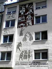 Unten habe ich ja schon in das Thema “Spruchweisheit der unheimlichen Art” eingeführt. Allerdings fehlte noch etwas Wesentliches. Den wohl gruseligsten aller 50er-Jahre-Sprüche findet man auf einem Nachkriegshaus in der maxvorstädter Heßstraße, illustriert von markerschütternd moderner Lüftelmalerei. Ich hab da mal ein Bild gemacht (entschuldigt die schlechte Qualität, hab nur eine Handykamera):