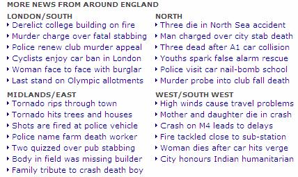 So schaut’s typischerweise bei den BBC News UK aus. Jedesmal, wenn ich diese Seite aufschlage, kommt es mir wie ein Wunder vor, dass in Großbritannien überhaupt noch Menschen am Leben sind…