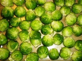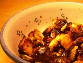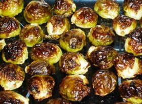 Erstmal werden die Rosenkohlköpfe geputzt, gewaschen und halbiert. Dann habe ich etwa 2 EL Sonnenblumenöl und 1/2 Tl Öl von geröstetem Sesam (bei den Asia-Zutaten, das darf man nicht weglassen!) zugegeben und alles schön vermischt. Die halben Köpfe wurden dann in eine Auflaufform gesetzt, mit der Schnittfläche nach unten, und vierzig Minuten bei 200° Umluft (wenn man keine Umluft hat, dementsprechend heißer, also so 230°) gebacken. Am Schluss sehen sie praktisch schon verbrannt aus, also sehr, sehr dunkelbraun (und papierartig knusprig), aber noch nicht schwarz. Dann habe ich etwas Butter dazugegeben und die Soße angerührt: ca 2 EL warmes Wasser, darin einen guten TL braunen Rohrohrzucker aufgelöst. Dazu einen TL vom "Dijon-Senf mit Honig" (gibt es von Maille) und einen Spritzer Zitronensaft. Als krönender Abschluss kamen noch eine Handvoll Pistazienkerne dazu. Und was soll ich sagen: ein Gedicht. Der manchmal selbst mir etwas unangenehme Kohlgeschmack der Röschen verschwindet vollständig, stattdessen werden sie sehr nussig und süßlich – das muss eigentlich jedem schmecken! Aufgrund seines Aussehens, und da ja Halloween schon wieder naht, gebe ich diesem großartigen Gericht den Namen "Gebackene Kröten", oder, für den francophilen Gourmet: "Crapauds au four".