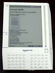 Beim gestrigen Vortrag des Stanford-Bibliothekars Michael Keller zum Thema "The Future of Books" gab es für die wenigen unter den Zuhörern, die die Sendlinger Mordweihnacht nicht mehr selbst miterlebt hatten, nicht viel Neues zu hören. Dafür aber was Neues zu sehen bzw. zu befummeln: das Amazon Kindle. Cohu ist seit jeher keine blindwütige Buchfetischistin, sondern eine Contentophile, und daher solchen medialen Neuerungen gegenüber stets aufgeschlossen. Leider, oh leider genügt das Kindle meinen Ansprüchen nicht: zwar ist die Bildschirmqualität exquisit und das Lesen an sich angenehm – schön auch Funktionen wie die Schriftgrößeneinstellung – doch, ojeh, der Bildschirm baut sich viel zu langsam auf, so dass man nach dem Blättern einen Moment auf die neue Seite warten muss; deshalb ist Speedreading genauso unmöglich wie das vom Computer gewohnte Scrollen. Dazu kommen kleinere Probleme: das Kindle wird nicht von allen schön gefunden (s.Abb.), manch einer findet die Verschwendung von Bildschirmplatz für eine volle Tastatur hirnrissig, und – lästiges Detail – das Kindle ist an allen Ecke und Kanten dermaßen mit Knöpfen und Tasten übersät, dass man es gezwungenermaßen beim Hochheben auch umblättert. Also, einige Modelle muss man da wohl noch abwarten, bis die Anschaffung eines solchen elektronischen Büchleins Sinn macht. Mal ganz abgesehen davon, dass das Kindle und seine exquisiten Belieferungsfunktionen momentan eh noch nicht in Europa erhältlich – und in den USA ausverkauft – sind.