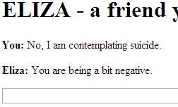 Wer mit Computer-Verhaltenstherapie unzufrieden bzw. kein NHS-Kunde ist, kann sich immerhin an der altbekannten Internetzanalytikerin ELIZA abreagieren. Allerdings mit zweifelhaften, leicht passiv-aggressiven Ergebnissen, was die Suizidprävention angeht: siehe Abb.