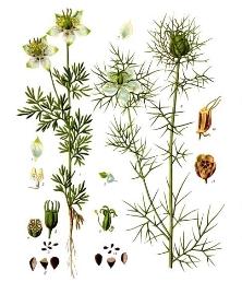 Moment: ganz nackert waren sie natürlich nicht. Essentieller Bestandteil dieser Brotspezialität ist (neben einem Becher Joghurt und einem Eiweiß im Teig) Schwarzkümmel oder Nigella sativa. Gourmets kennen vielleicht die britische Fernsehköchin Nigella Lawson, die nach dem Kraut benannt ist; Gartenfreunden dürfte eine enge Verwandte der Nigella, die sogenannte "Jungfer im Grünen" ein Begriff sein (s. Abb.). Alles Wissenswerte und noch etwas mehr über dieses Gewürz findet man wie immer auf Gernot Katzers exzellenten Gewürzseiten. Der Schwarzkümmel ist leider nicht so leicht zu bekommen (ich fand ihn nach längerer Suche schließlich im Bioladen), aber für Pide unabdingbar. Idealerweise bestreut man das Brot zusätzlich auch noch mit Sesam (im Bio- oder Asialaden). Sehr schön ist das weiche, saftige Brot für Picknicks, zu Salat oder vor allem zu Gegrilltem: mein Geheimtipp dafür ist Adana Kebap – mehr dazu ein andermal – die Türken sind nämlich auch wahre Grillmeister, was jeder, der schon mal an einem Sonntag im Westpark war und eine funktionstüchtige Nase besitzt, bestätigen wird.