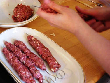 Während dann das Brot im Ofen bäckt, macht man aus Hackfleisch, Zwiebeln und Pulbiber, Sumak Kreuzkümmel, Piment, Pfeffer und Salz Spießchen (ideal wäre fettes Lammhack, Rind tut’s auch). Eigentlich bräuchte man dafür spezielle, breite Metallspieße, normale Schaschlikspieße gehen aber auch, wie man sieht: