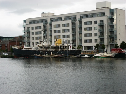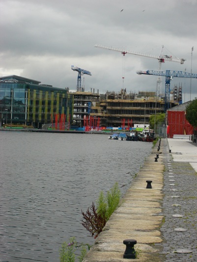 Wie man das von Entwicklungsländern kennt, die unverhofft zu Geld gekommen sind, verprasst Dublin seine bzw. EU-Milliarden für lächerliche Glas-und-Stahl-Architektur und für kitschige Bronzestatuen von Helden der nationalen Befreiung (sowas steht hier alle paar Meter rum und stammt nicht aus dem sozialistischen Realismus des Ostblocks der siebziger Jahre, sondern ist in der Regel höchstens ein paar Jahre alt und von “internationalen Künstlern” gestaltet…). Der Gipfel der Geldausgebewut sind allerdings die “Docklands” nach Art der Hamburger Hafencity. Hier soll der urbane Chic darüber hinwegtäuschen, dass, äh, ja, hm, inzwischen die Rezession zuschlägt und so mancher hoffnungsvolle Sohn dieser Stadt sich auch gerne mal dem liebevoll gestopften Crackpfeiferl widmet, statt der Wirtschaft wieder auf die Beine zu helfen. Hier nun also ein paar Impressionen aus diesem Viertel der Stadt, in dem wir (aus beruflichen Gründen) ein Hotel bezogen hatten – wie ihr seht, war das Wetter ganz nach meinem Geschmack.