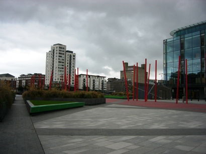 Blick auf den Grand Canal Square. Ums Eck ist übrigens das Aufnahmestudio von U2, das 2011 in den sog. U2-Tower umziehen wird. Der soll natürlich, wie könnte es anders sein, das “tallest building of Ireland” werden. Zu sehen war davon noch nix.