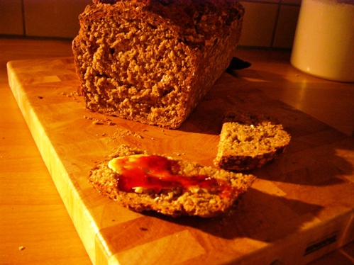 Die trockenen Zutaten sieben und sehr gut vermischen (aus dem VK-Mehl ausgesiebte Kleie einfach wieder dazugeben). Währenddessen Ofen und Backblech bzw. Kastenform auf 230° vorheizen. Buttermilch zu den trockenen Zutaten gießen und verrühren. Es soll einen bazigen und klebrigen Teig geben, der nicht besonders homogen sein muss, nur halt irgenwie zusammenhält. Da die Buttermilch nun sofort beginnt, mit dem Natron zu reagieren und der Teig aufgeht, soll man so kurz wie möglich kneten. Dann Teig in einen Batzen rollen und evt noch in Haferflocken oder Kleie wälzen, in die heiße (!) Kastenform geben bzw. auf das Backblech (dann mit Backpapier). bei 230°C 10 Minuten backen, auf 200° runterschalten und noch mal 35 Minuten backen. Also mir schmeckts…