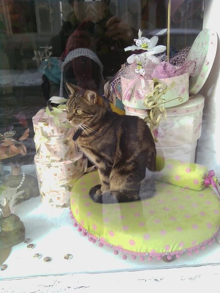 (Ich hab die Hutmiez immer für eine “Sie” gehalten. Naja, wer weiß, was für ein wildes Doppelleben Euer Moritz führt – verwegene Schaufensterkatze bei Tag, braver Sofakater bei Nacht… Buchidee: “The cat in the drag!”)